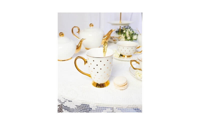 De mok is gemaakt van hoogwaardig New Bone China en afgewerkt met handgeschilderde stippen van echt 24-karaats goud. De subtiele gouden polkadots geven het servies een verfijnde en luxueuze uitstraling. Perfect voor het serveren van thee, koffie of andere warme dranken tijdens een High Tea of een bijzonder moment aan tafel.
